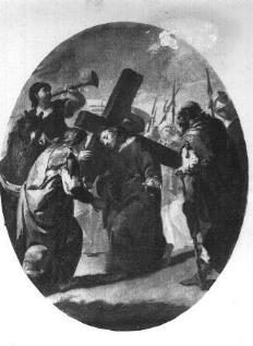 Ogni quadro ha forma ovale (63 X 78) ed eseguito con la tecnica olio su tela. Risalgono al secolo XVIII e sono ritenute opera della scuola tiepolesca. L'ultimo restauro risale al 1947. Di esso sono rimaste le fotografie in bianco e nero. Riportiamo quella della morte in croce e dell'incontro con la madre. |